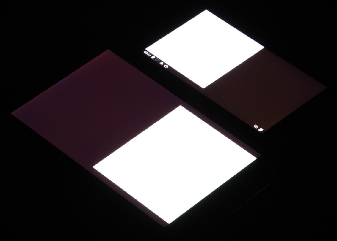 Яркость под углом у экранов уменьшилась (как минимум в 5 раз, исходя из разницы в выдержке), но у Ulefone Be Touch 2 экран чуть-чуть темнее (средняя яркость по фотографиям 230 против 234 у Nexus 7). Черное поле при отклонении по диагонали высветляется слабо и приобретает красно-фиолетовый оттенок. Фотографии ниже это демонстрируют (яркость белых участков в перпендикулярном плоскости экранов направлении одинаковая!):