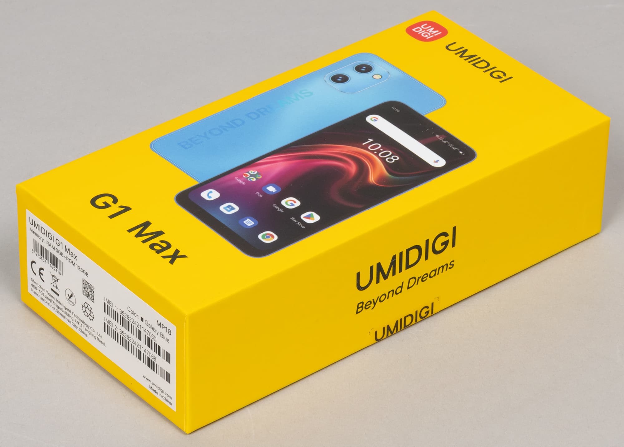 Umidigi G1 Max поставляется в твердой картонной упаковке с ярким броским оформлением.