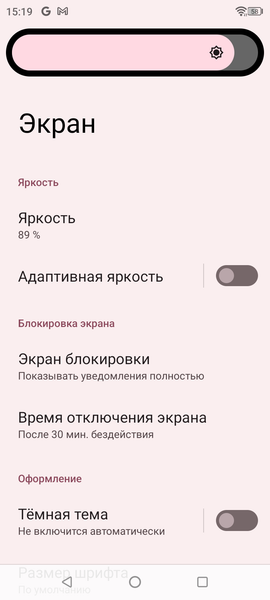 При ручном управлении яркостью и при выводе белого поля во весь экран максимальное значение яркости составило всего около 380 кд/м². Максимальная яркость невысокая, но, учитывая отличные антибликовые свойства, смартфоном как-то можно будет пользоваться даже в солнечный день вне помещения. Минимальное значение яркости — 22 кд/м² при ручном управлении, поэтому в полной темноте яркость можно понизить до комфортного значения. В наличии автоматическая регулировка яркости по датчику освещенности (он находится справа от решетки фронтального громкоговорителя у верхнего края фронтальной панели). В автоматическом режиме при изменении внешних условий освещенности яркость экрана как повышается, так и понижается. Работа этой функции зависит от положения ползунка регулировки яркости: им пользователь может попытаться выставить желаемый уровень яркости в текущих условиях. Если не вмешиваться, то в полной темноте функция автояркости уменьшает яркость до 12 кд/м² (сойдет), в условиях освещенного искусственным светом офиса (примерно 550 лк) устанавливает на 380 кд/м² (излишне ярко), под очень ярким светом, условно на прямом солнечном свету повышает до 380 кд/м² (до максимума, так и нужно). Результат по умолчанию нас удовлетворил, но для эксперимента мы попробовали повысить (понизить уже нельзя) яркость в полной темноте. В темноте яркость стала выше, но завышение яркости экрана в «офисе» никуда не делось. Происходит это из-за того, что датчик освещенности выдает сильно завышенные показания. Получается, что функция автоподстройки яркости работает не совсем адекватно, но все же позволяет пользователю хоть как-то настраивать свою работу под индивидуальные требования. На любом уровне яркости значимая модуляция подсветки отсутствует, поэтому нет и никакого мерцания экрана.