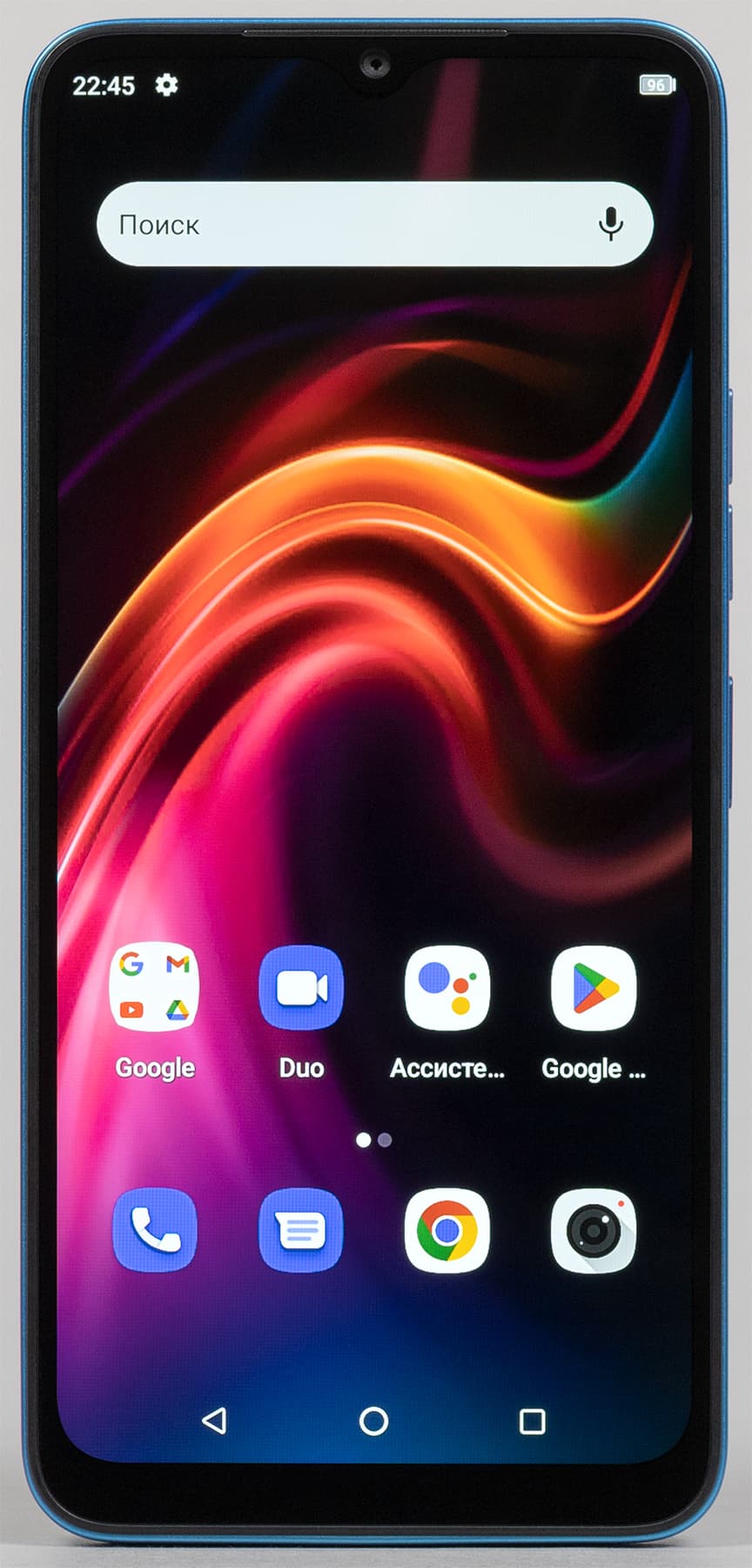 Фронтальная камера установлена за каплевидным вырезом в матрице экрана — прямо по центру. Светодиодного индикатора событий нет.
