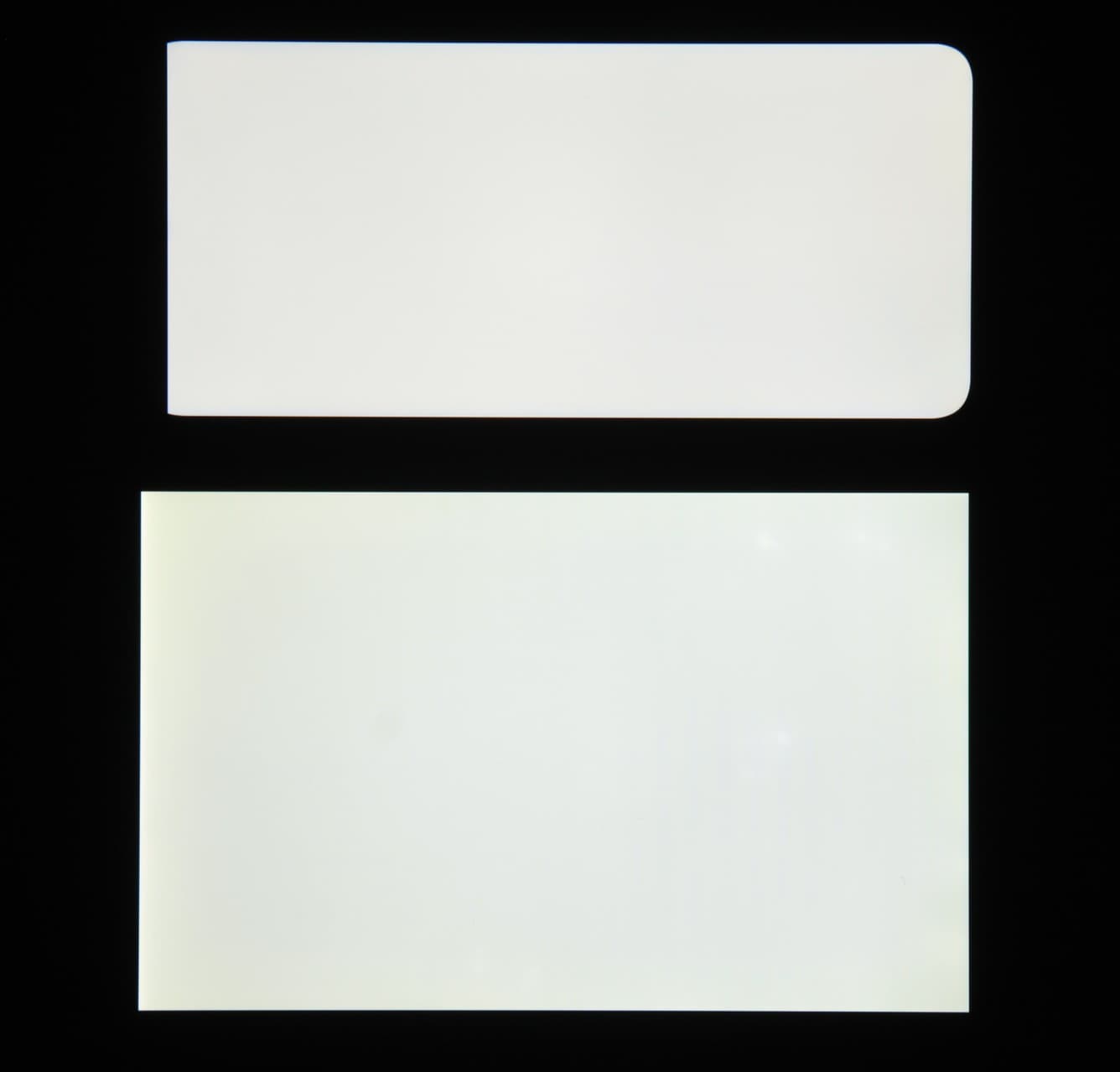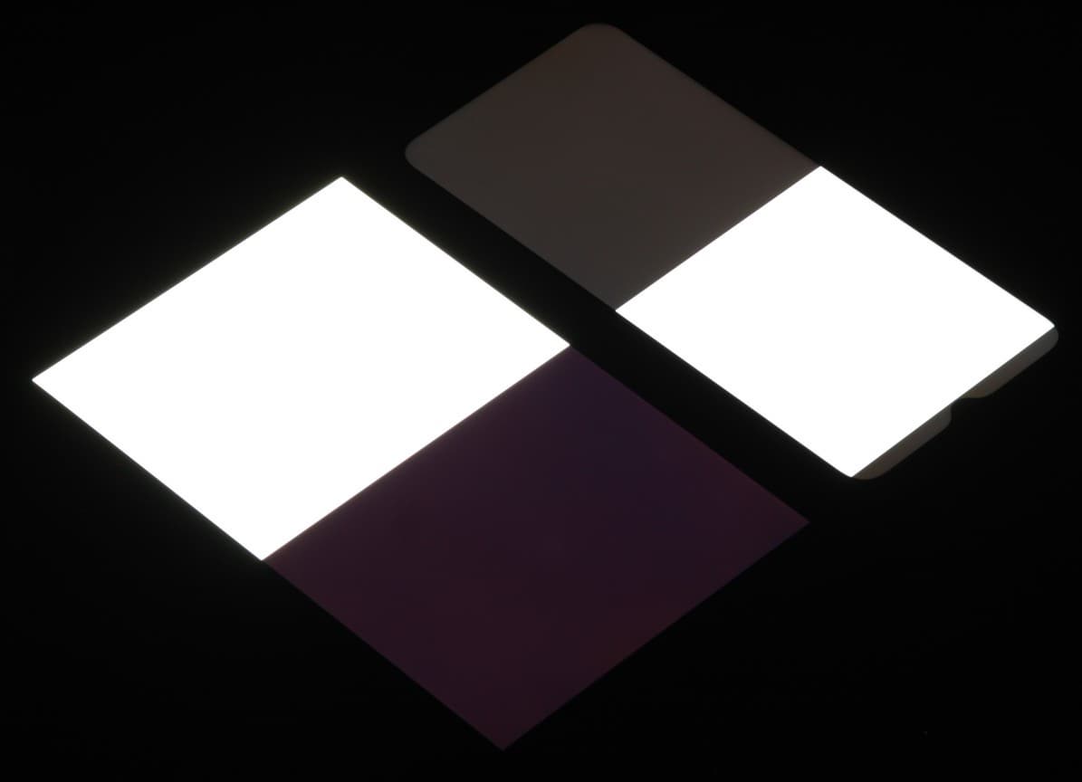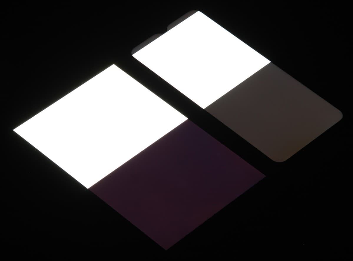 Яркость под углом у экранов уменьшилась (как минимум в 5 раз, исходя из разницы в выдержке), но в случае Umidigi G1 Max яркость снизилась заметно больше. Черное поле при отклонении по диагонали сильно высветляется (особенно относительно яркости белого поля под тем же углом), но остается условно нейтрально-серым (так видно глазом). Фотографии ниже это демонстрируют (яркость белых участков в перпендикулярном плоскости экранов направлении одинаковая!):