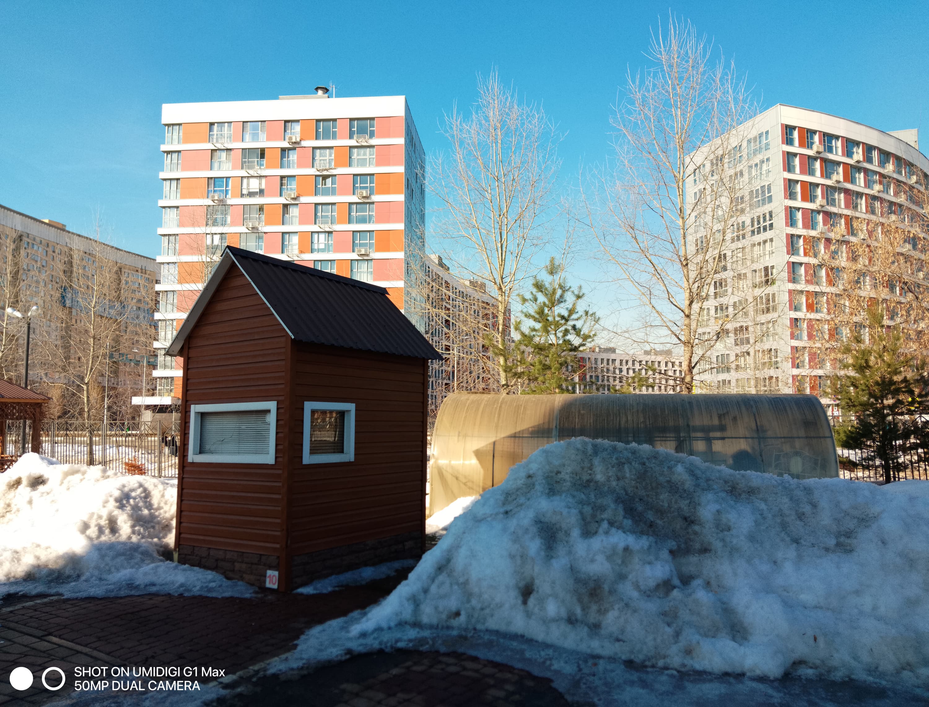 Уровень съемки откровенно слабый. Детализация в 50-мегапиксельном режиме не самая плохая, но картинка при этом испещрена неприятными шумовыми артефактами, разглядывать такие снимки в полный размер не хочется. Для получения же 12,5-мегапиксельных фотографий применяется крайне неумелая обработка, уничтожающая при подавлении шумов даже намеки на детали, причем выборочно, кусками. Динамического диапазона матрицы недостаточно для обычных дневных снимков, причем программа обработки не может найти даже приемлемый баланс: то всё слишком темное, то всё пересвеченное. В общем, при текущем уровне программной реализации камера годится лишь для создания миниатюр, до уровня обработки в SoC Qualcomm и MediaTek тут очень далеко.