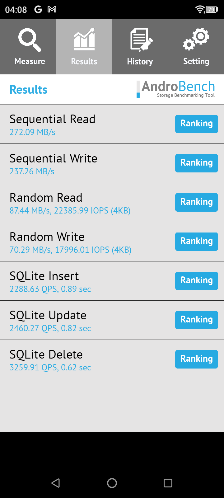 Результаты теста AndroBench на скорость работы с памятью: