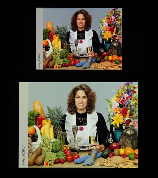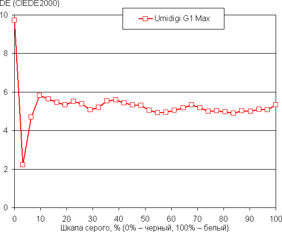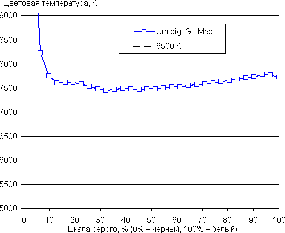 Баланс оттенков на шкале немного компромиссный, так как цветовая температура выше стандартных 6500 К, но отклонение от спектра абсолютно черного тела (ΔE) ниже 10, что само по себе для потребительского устройства считается приемлемым показателем. При этом цветовая температура и ΔE мало изменяются от оттенка к оттенку — это положительно сказывается на визуальной оценке цветового баланса. (Самые темные области шкалы серого можно не учитывать, так как там баланс цветов не имеет большого значения, да и погрешность измерений цветовых характеристик на низкой яркости большая.)