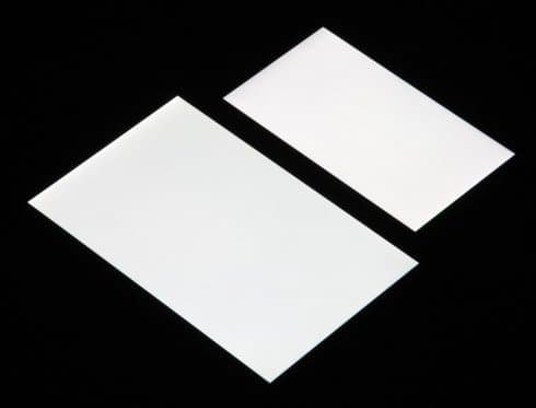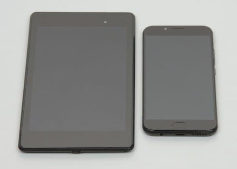 Лицевая поверхность экрана выполнена в виде стеклянной пластины с зеркально-гладкой поверхностью, устойчивой к появлению царапин. Судя по отражению объектов, антибликовые свойства экрана примерно как у экрана Google Nexus 7 (2013) (далее просто Nexus 7). Для наглядности приведем фотографию, на которой в выключенных экранах отражается белая поверхность (слева — Nexus 7, справа — Umidigi S, далее их можно различать по размеру):