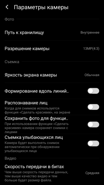 Применяемый интерфейс управления камерой у смартфонов Bluboo и Umidigi сейчас одинаков, и это не самое удобное меню. Оно копирует лаконичный стиль камеры iPhone с прокручивающейся внизу шкалой режимов, только там наверху отображается текущее значение настройки, а здесь оно в некоторых случаях наверху не только отображается, но и изменяется. Например, разрешение фотосъемки здесь меняется стандартным образом, через общий список настроек, а вот выбора разрешения видеосъемки там нет, нужно искать его отдельно и еще догадаться нажать в верхнюю часть экрана. Отдельного режима с ручными настройками нет вовсе.