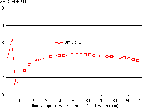 Баланс оттенков на шкале серого слегка компромиссный, так как цветовая температура значимо выше стандартных 6500 К, однако отклонение от спектра абсолютно черного тела (ΔE) ниже 10, что для потребительского устройства считается приемлемым показателем. При этом оба параметра несильно изменяются от оттенка к оттенку — это положительно сказывается на визуальной оценке цветового баланса. (Самые темные области шкалы серого можно не учитывать, так как там баланс цветов не имеет большого значения, да и погрешность измерений цветовых характеристик на низкой яркости большая.)