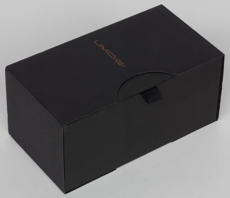 Umidigi S поставляется в продажу в необычно и стильно оформленной коробке из черного картона с золотистыми надписями и несколькими отдельно открывающимися ящичками на манер походного сундука.