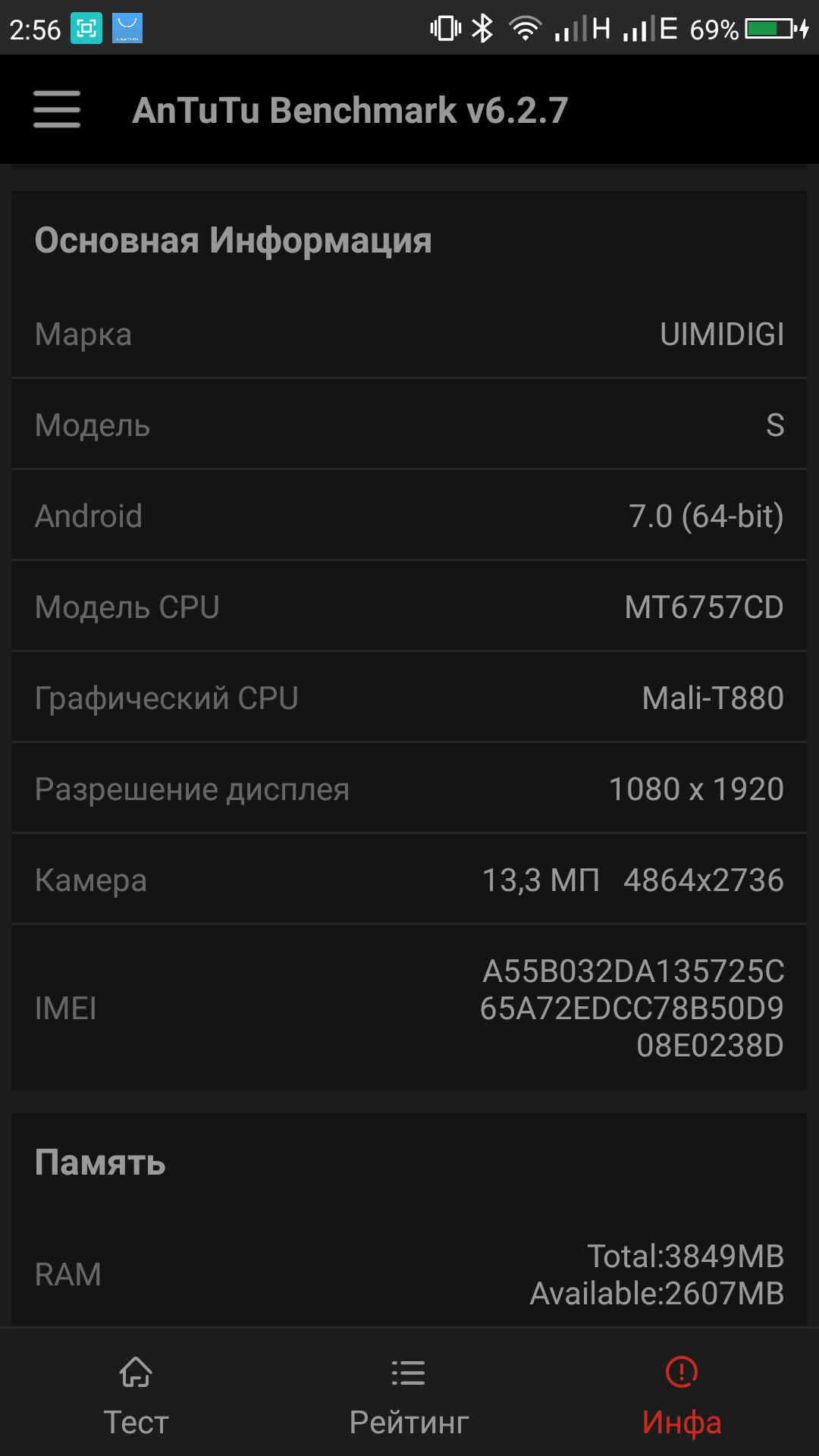 Аппаратная платформа Umidigi S строится на однокристальной системе MediaTek MT6757CD, выполненной по 16-нанометровой технологии. В состав этой SoC входят восемь 64-битных ядер ARM Cortex-A53 в двух кластерах с частотой до 1,6/2,3 ГГц. За обработку графики отвечает двухъядерный GPU Mali-T880 с частотой 900 МГц. Объем оперативной памяти составляет 4 ГБ, а встроенной флэш-памяти — 64 ГБ. Из них свободно около 50,5 ГБ хранилища и около 2 ГБ ОЗУ.