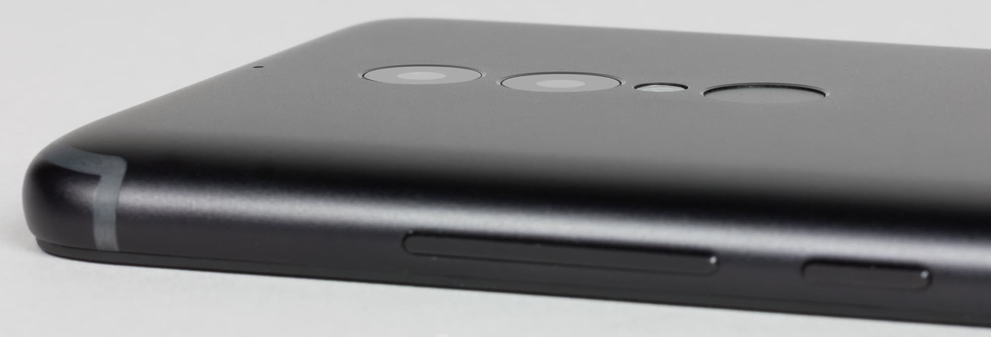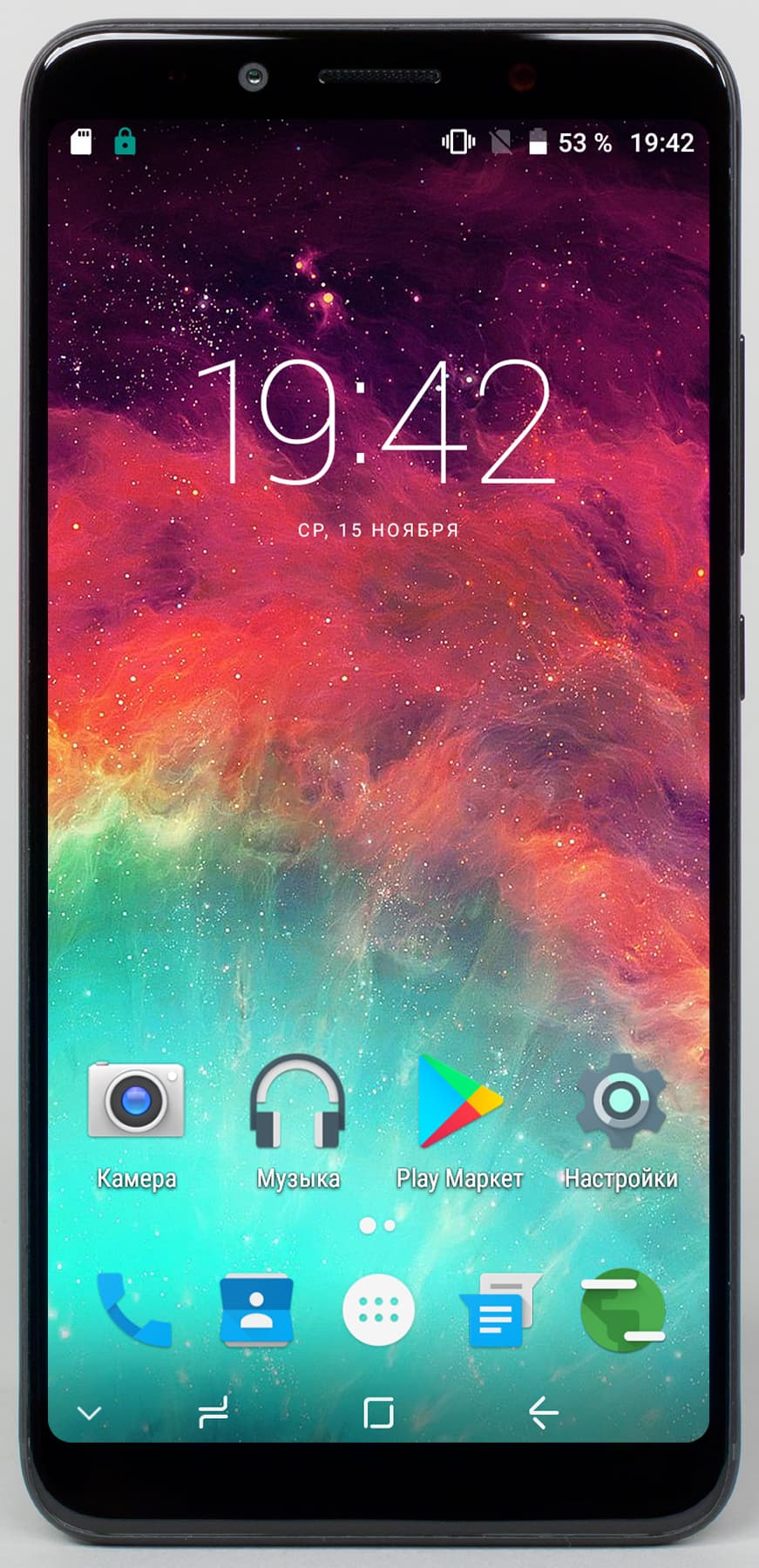 Передняя панель имеет непривычные пропорции: дисплей вытянут и имеет соотношение сторон 18:9, что компенсируется тонкой рамкой вокруг экрана — ее ширина составляет снизу и сверху всего по 10 мм. Создатели не устают повторять, что им удалось вписать 6-дюймовый дисплей в привычные для 5,5-дюймового стандартного смартфона размеры. Хотелось бы, правда, чтобы у дисплея было повыше разрешение: здесь оно составляет 1440×720, так что плотность точек на дюйм у огромного 6-дюймового экрана всего 268 ppi.
