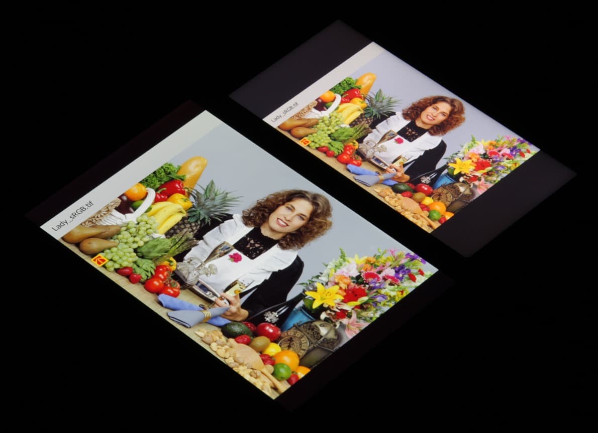 Экран имеет хорошие углы обзора без значительного сдвига цветов даже при больших отклонениях взгляда от перпендикуляра к экрану и без инвертирования оттенков. Для сравнения приведем фотографии, на которых на экраны Umidigi S2 и Nexus 7 выведены одинаковые изображения, при этом яркость экранов изначально установлена примерно на 200 кд/м², а цветовой баланс на фотоаппарате принудительно переключен на 6500 К.