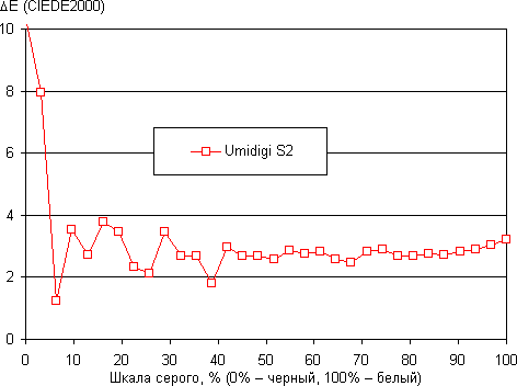 Баланс оттенков на шкале серого хороший, так как цветовая температура близка к стандартным 6500 К, а отклонение от спектра абсолютно черного тела (ΔE) ниже 10, что для потребительского устройства считается приемлемым показателем. При этом оба параметра несильно изменяются от оттенка к оттенку — это положительно сказывается на визуальной оценке цветового баланса. (Самые темные области шкалы серого можно не учитывать, так как там баланс цветов не имеет большого значения, да и погрешность измерений цветовых характеристик на низкой яркости большая.)