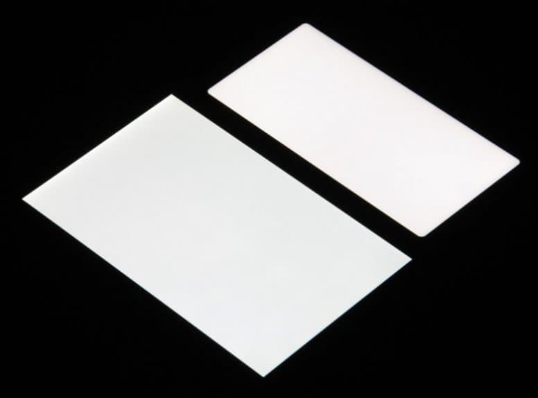 Лицевая поверхность экрана выполнена в виде стеклянной пластины с зеркально-гладкой поверхностью, устойчивой к появлению царапин. Судя по отражению объектов, антибликовые свойства экрана примерно как у экрана Google Nexus 7 (2013) (далее просто Nexus 7). Для наглядности приведем фотографию, на которой в выключенных экранах отражается белая поверхность (слева — Nexus 7, справа — Umidigi S2, далее их можно различать по размеру):