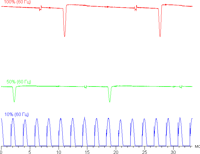 Видно, что на высокой и средней яркости скважность низкая, в итоге видимого мерцания нет. Однако при сильном понижении яркости появляется модуляция с большой относительной амплитудой и высокой скважностью (с частотой 480 кГц), ее наличие уже можно увидеть в тесте на присутствие стробоскопического эффекта или просто при быстром движении глаз. В зависимости от индивидуальной чувствительности такое мерцание может вызывать повышенную утомляемость. Впрочем, фаза модуляции различается по площади экрана, а частота довольно высокая, поэтому негативный эффект от мерцания снижен.