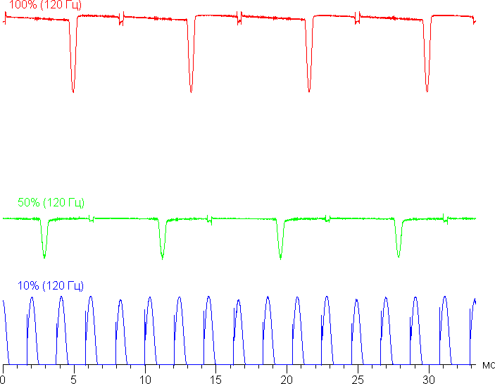 Частота модуляции на высокой и средней яркости увеличилась до 120 Гц, а на низкой характер модуляции такой же, как и в случае частоты обновления 60 Гц, поэтому мерцание можно обнаружить.