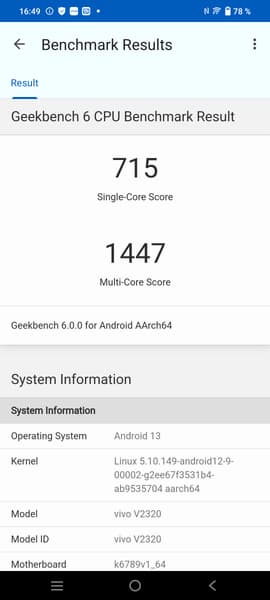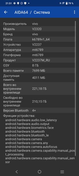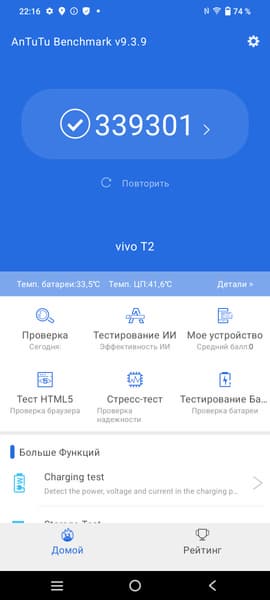 В качестве программной платформы Vivo T2 использует ОС Android 13 с собственной оболочкой Funtouch 13. Предустановлено очень много софта и игр. Верхняя шторка разделена на две части в зависимости от угла оттягивания. Доступ к официальному магазину приложений Google Play и сервисам Google на месте.