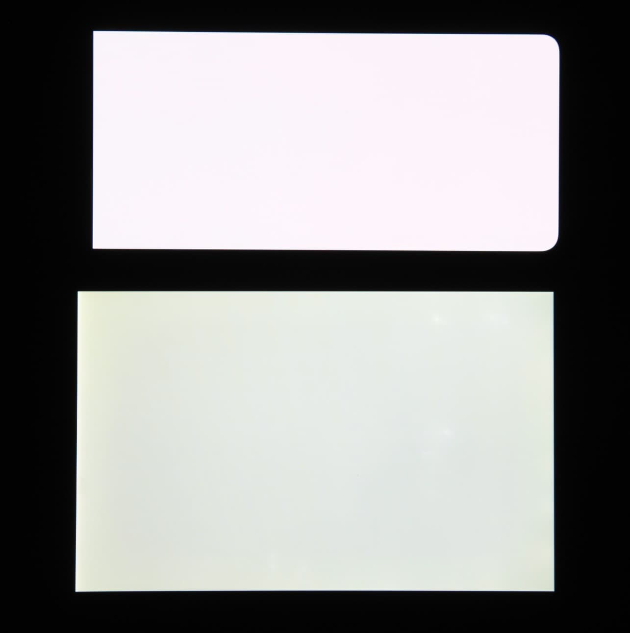 Экран характеризуется великолепными углами обзора. Правда, белый цвет при отклонении даже на небольшие углы приобретает легкие радужные оттенки, но черный цвет остается просто черным под любыми углами. Он настолько черный, что параметр контрастности в данном случае просто неприменим. Для сравнения приведем фотографии, на которых на экраны смартфона (он выше) и второго участника (Nexus 7 — ниже) выведены одинаковые изображения, при этом яркость экранов изначально установлена примерно на 200 кд/м², а цветовой баланс на фотоаппарате принудительно переключен на 6500 К.