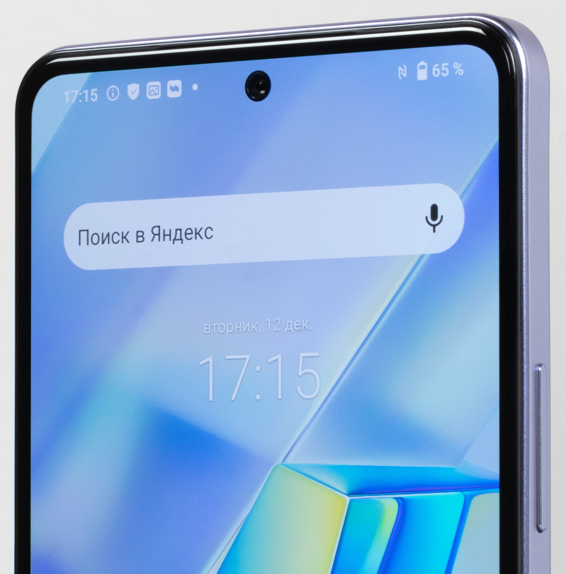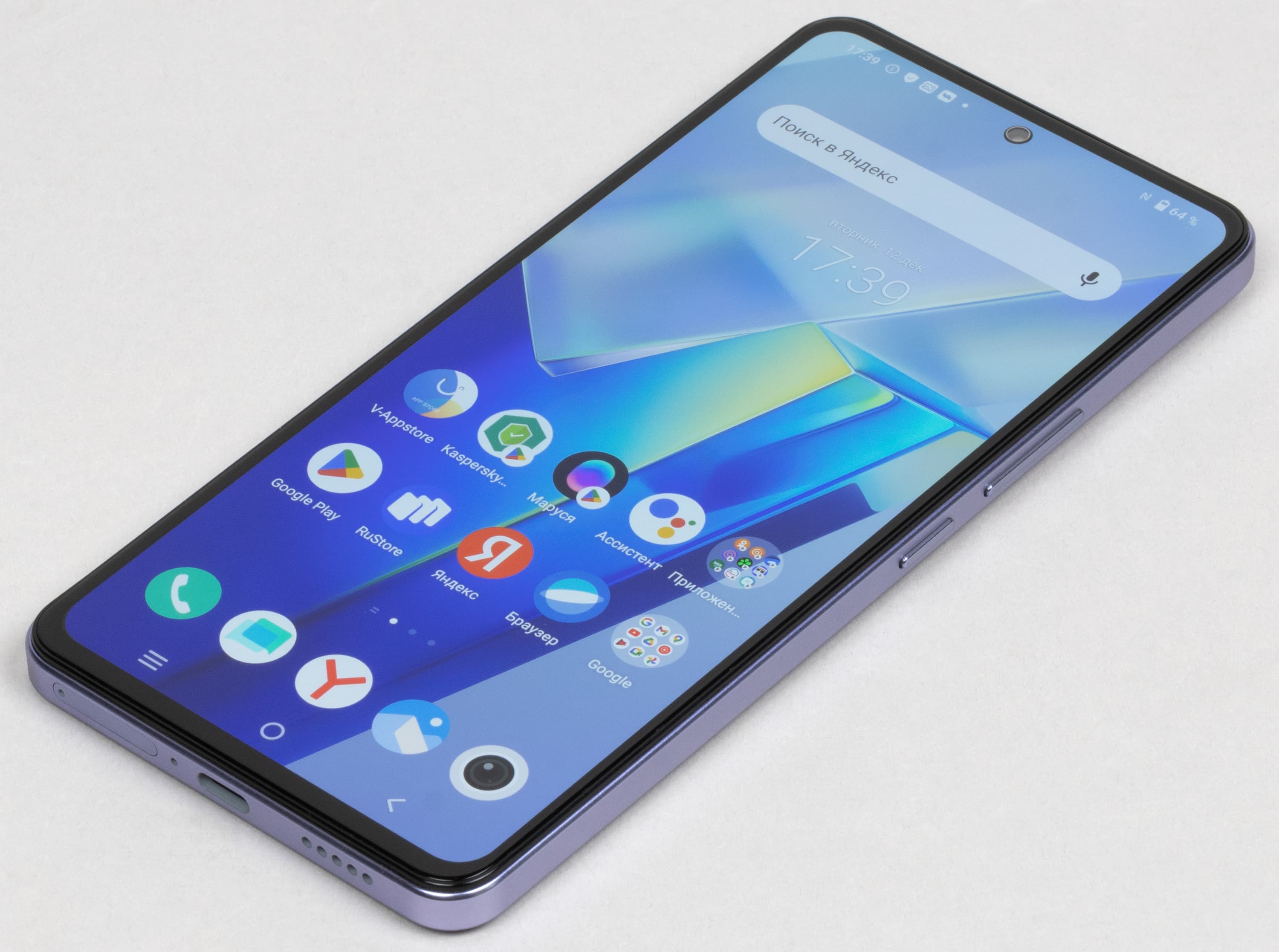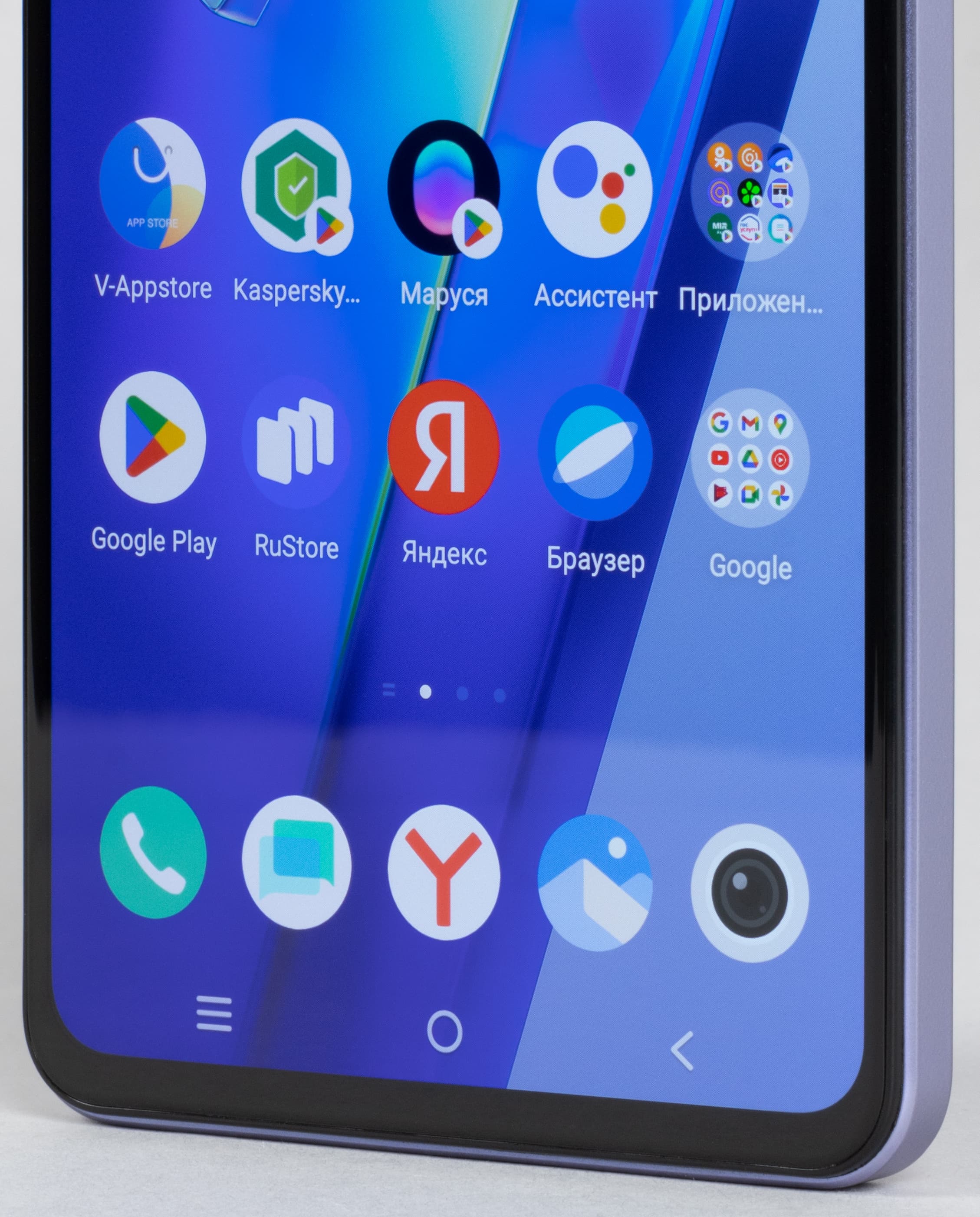 Одиночный глазок фронтальной камеры установлен за круглым вырезом в матрице экрана по центру верхней кромки.