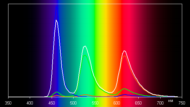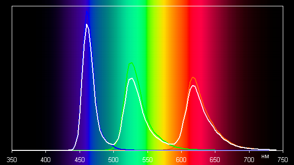 Без коррекции (вариант Яркий) спектры компонент (то есть спектры чистых красного, зеленого и синего цветов) очень хорошо разделены: