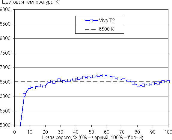 Даже в случае отсутствия дополнительной коррекции баланс оттенков на шкале серого в случае профиля Режим Pro хороший, так как цветовая температура близка к стандартным 6500 К, а отклонение от спектра абсолютно черного тела (ΔE) ниже 10 единиц, что для потребительского устройства считается приемлемым показателем. При этом цветовая температура и ΔE мало изменяются от оттенка к оттенку — это положительно сказывается на визуальной оценке цветового баланса: