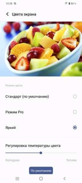 При ручном управлении яркостью и при выводе белого поля во весь экран максимальное значение яркости составило примерно 460 кд/м² в обычных условиях, на очень ярком свету оно может повышаться до 730 кд/м². Максимальная яркость очень высокая. В данном случае чем меньше площадь белого на экране, тем он светлее, то есть фактическая максимальная яркость белых участков будет почти всегда еще выше. В итоге, учитывая отличные антибликовые свойства, читаемость днем на солнце, должна быть на хорошем уровне, а темная тема не только экономит заряд аккумулятора, но способствует лучшей разборчивости информации на экране в условиях высокой освещенности. Минимальное значение яркости при ручном управлении — 2 кд/м², то есть пониженный уровень яркости без проблем позволяет использовать устройство даже в полной темноте. Есть автоматическая регулировка яркости по датчику освещенности (он расположен под экраном справа от фронтальной камеры). В автоматическом режиме при изменении внешних условий освещенности яркость экрана как повышается, так и понижается. Работа этой функции зависит от положения ползунка регулировки яркости: им пользователь может попытаться выставить желаемый уровень яркости в текущих условиях. Если оставить все по умолчанию, то в полной темноте функция автояркости уменьшает яркость до 5 кд/м² (темновато), в условиях освещенного искусственным светом офиса (примерно 550 лк) устанавливает на 80 кд/м² (можно было и ярче), а условно под прямыми лучами солнца повышает до 730 кд/м² (до максимума, так и нужно). Результат нас не совсем устроил, поэтому в полной темноте мы чуть увеличили яркость, получив в итоге для трех условий, указанных выше, следующие значения: 15, 100 и 730 кд/м² (идеальное сочетание). Получается, что функция автоподстройки яркости работает адекватно и позволяет пользователю настраивать свою работу под индивидуальные требования.