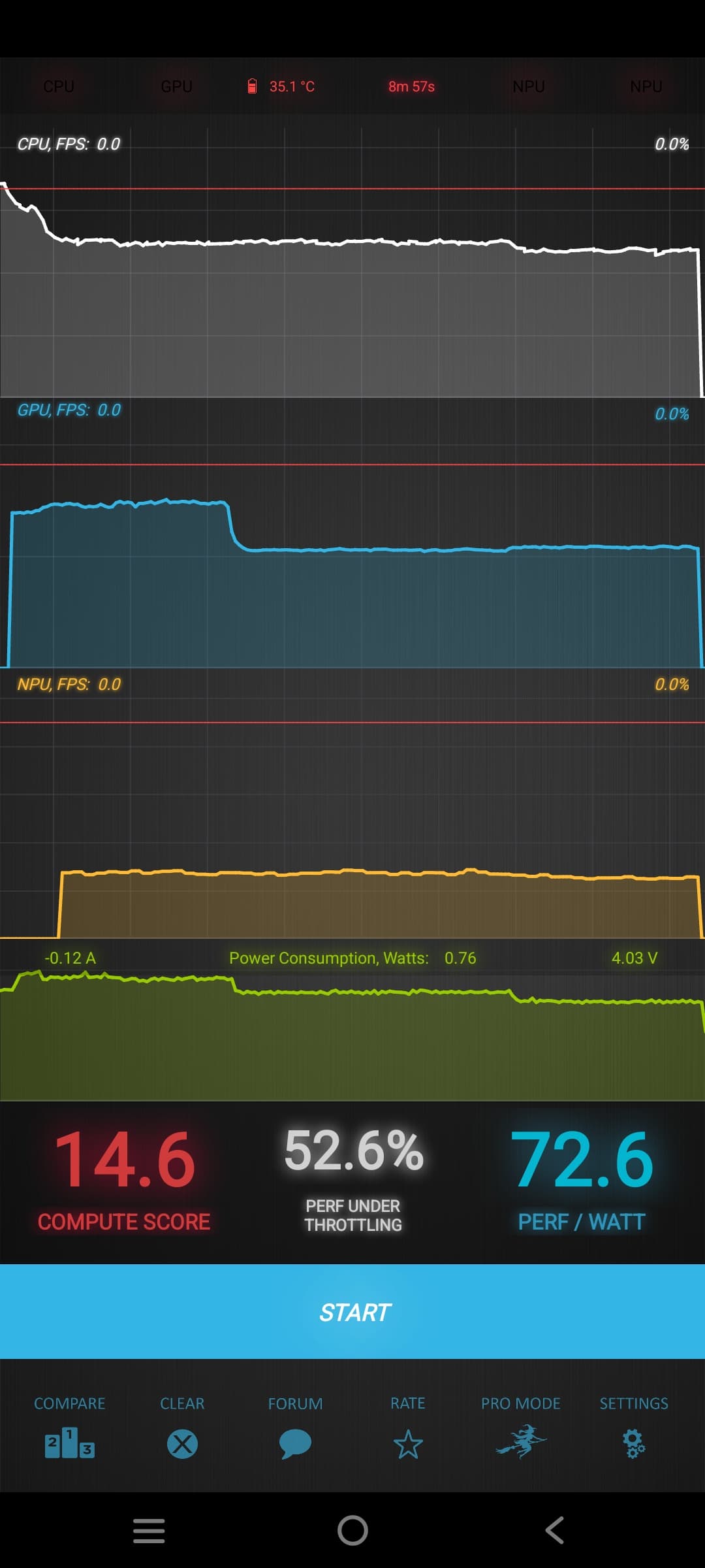 Тест на снижение производительности при нагреве мы проводим с помощью программы Burnout Benchmark, которая позволяет нагружать CPU, GPU и NPU: