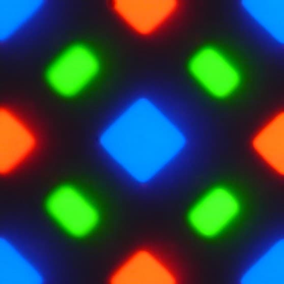 В этом экране используется матрица AMOLED — активная матрица на органических светодиодах. Полноцветное изображение создается с помощью субпикселей трех цветов — красного (R), зеленого (G) и синего (B), но красных и синих субпикселей в два раза меньше, что можно обозначить как RGBG. Это подтверждается фрагментом микрофотографии: