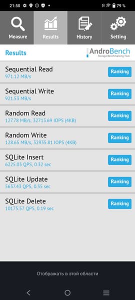 Результаты теста AndroBench на скорость работы с памятью: