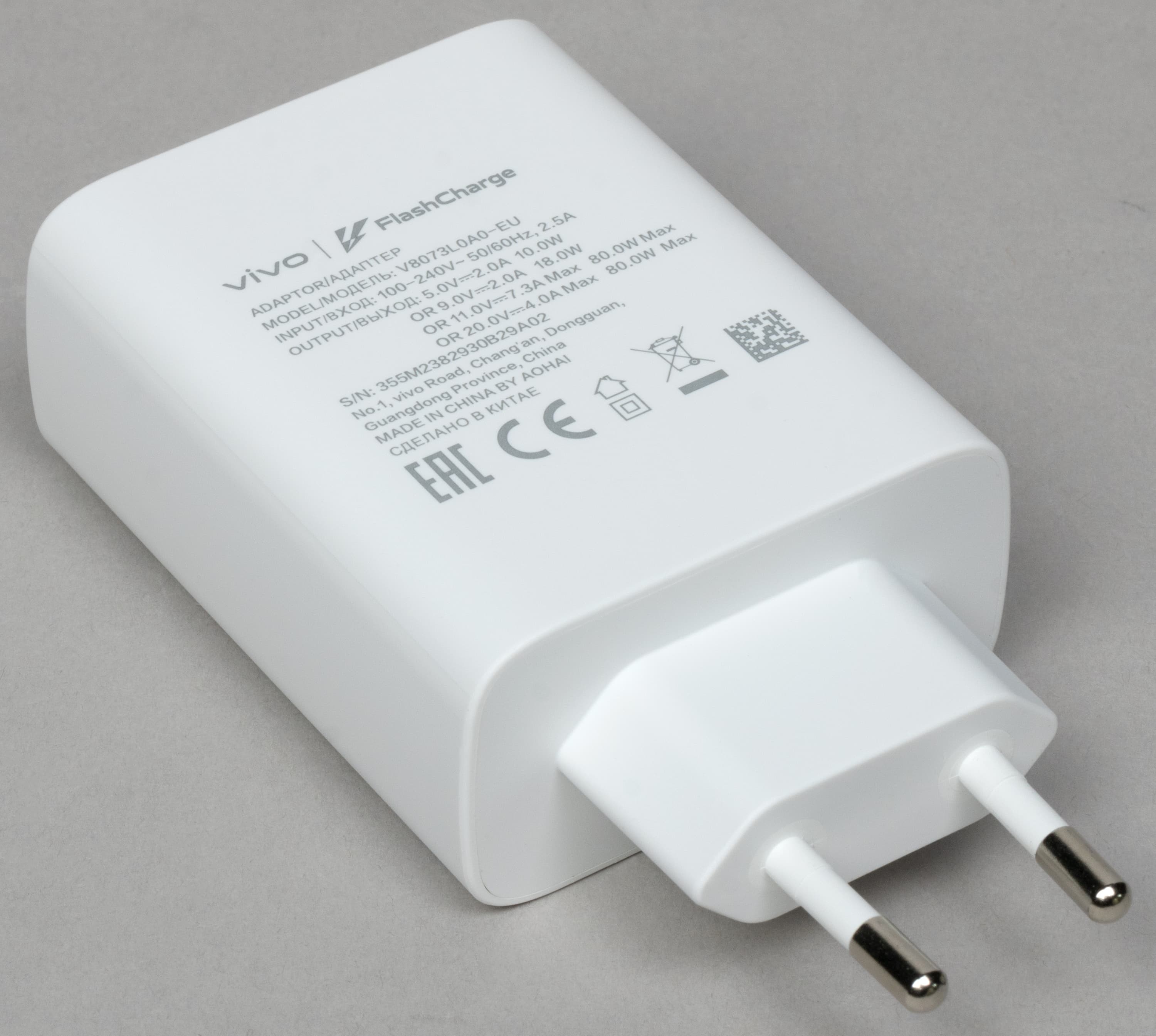 Поставляемое в комплекте сетевое зарядное устройство имеет максимальную мощность 80 Вт, но Vivo T2 всё равно ограничен при зарядке мощностью 66 Вт и полностью заряжается менее часа (минут за 50). Беспроводная зарядка не поддерживается.