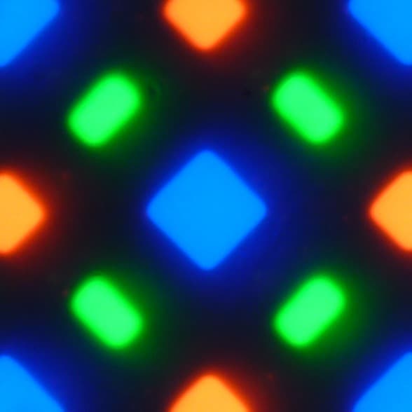 В этом экране используется матрица AMOLED — активная матрица на органических светодиодах. Полноцветное изображение создается с помощью субпикселей трех цветов — красного (R), зеленого (G) и синего (B), но красных и синих субпикселей в два раза меньше, что можно обозначить как RGBG. Это подтверждается фрагментом микрофотографии: