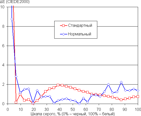Даже в случае отсутствия коррекции баланс оттенков на шкале серого в случае профиля Нормальный режим приемлемый, так как цветовая температура не сильно выше стандартных 6500 К, а отклонение от спектра абсолютно черного тела (ΔE) ниже 3 единиц, что для потребительского устройства считается отличным показателем. При этом цветовая температура и ΔE мало изменяются от оттенка к оттенку — это положительно сказывается на визуальной оценке цветового баланса. В случае профиля Стандартный режим цветовая температура уже существенно выше 6500 К: