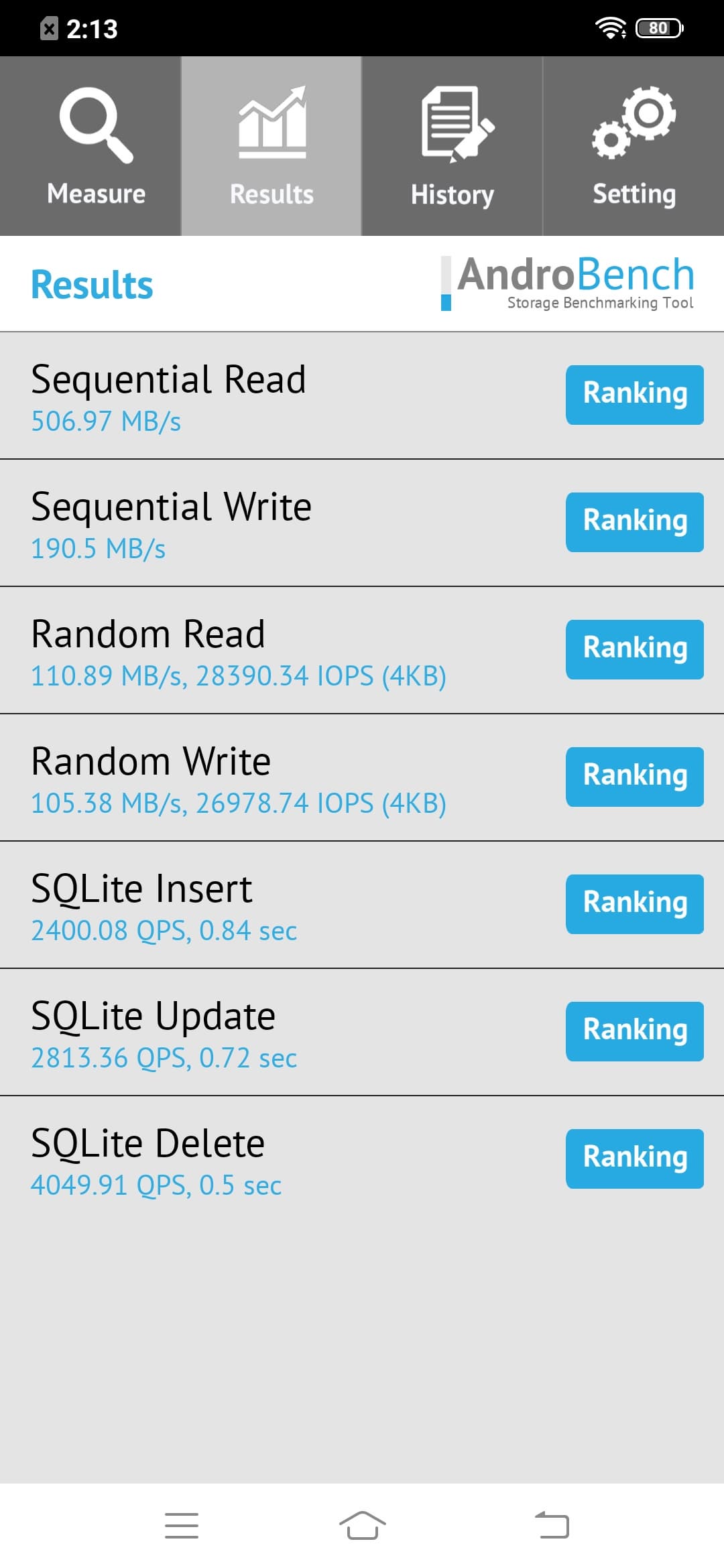 Результаты теста AndroBench на скорость работы с памятью: