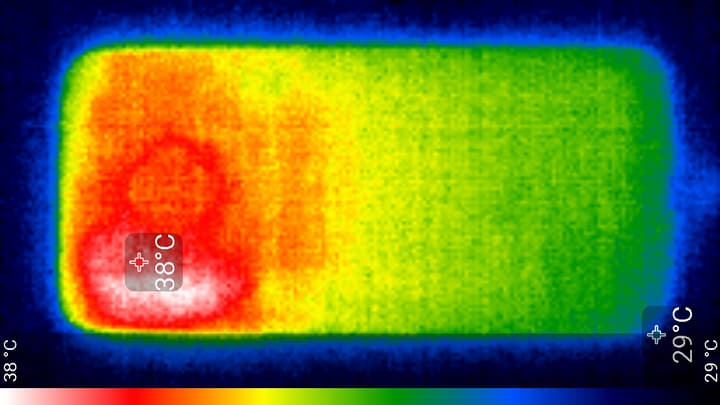 Нагрев больше в верхней правой части аппарата, что, видимо, соответствует расположению микросхемы SoC. По данным теплокамеры, максимальный нагрев составил 38 градусов (при температуре окружающего воздуха в 24 градуса), это не очень много.
