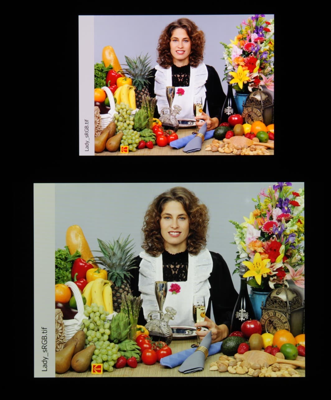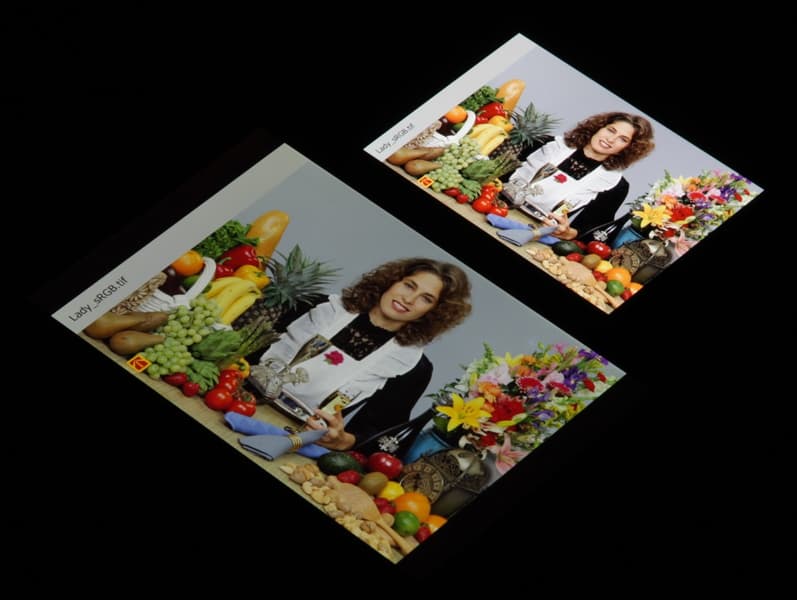 Согласно визуальной оценке, цвета у тестируемого экрана более-менее естественные, а цветовой баланс экранов немного различается. Напомним, что фотография не может служить надежным источником сведений о качестве цветопередачи и приводится только для условной наглядной иллюстрации. В частности, выраженный красноватый оттенок белого и серого полей, присутствующий на фотографиях тестируемого экрана, при перпендикулярном взгляде визуально отсутствует, что подтверждается аппаратными тестами с помощью спектрофотометра. Причина в том, что спектральная чувствительность матрицы фотоаппарата неточно совпадает с этой характеристикой человеческого зрения. Фотография выше получена после выбора профиля Нормальный режим в настройках экрана, всего их три.