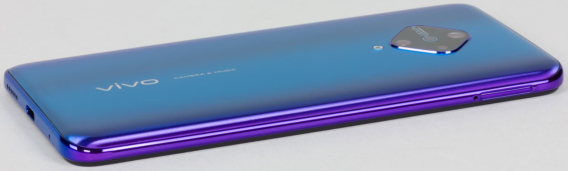 У Vivo v17 был бы самый обычный по сегодняшним меркам дизайн, если бы не оформление тыльной камеры — ромбом. Разработчики нашли отличный вариант размещения четырех глазков камер — явно лучше, чем в Apple iPhone 11 и уж тем более в Huawei Mate 30 Pro.