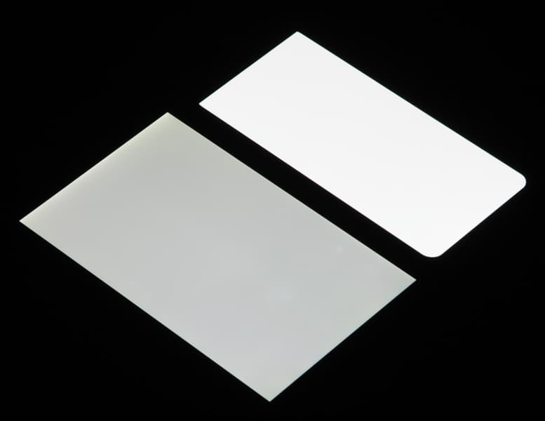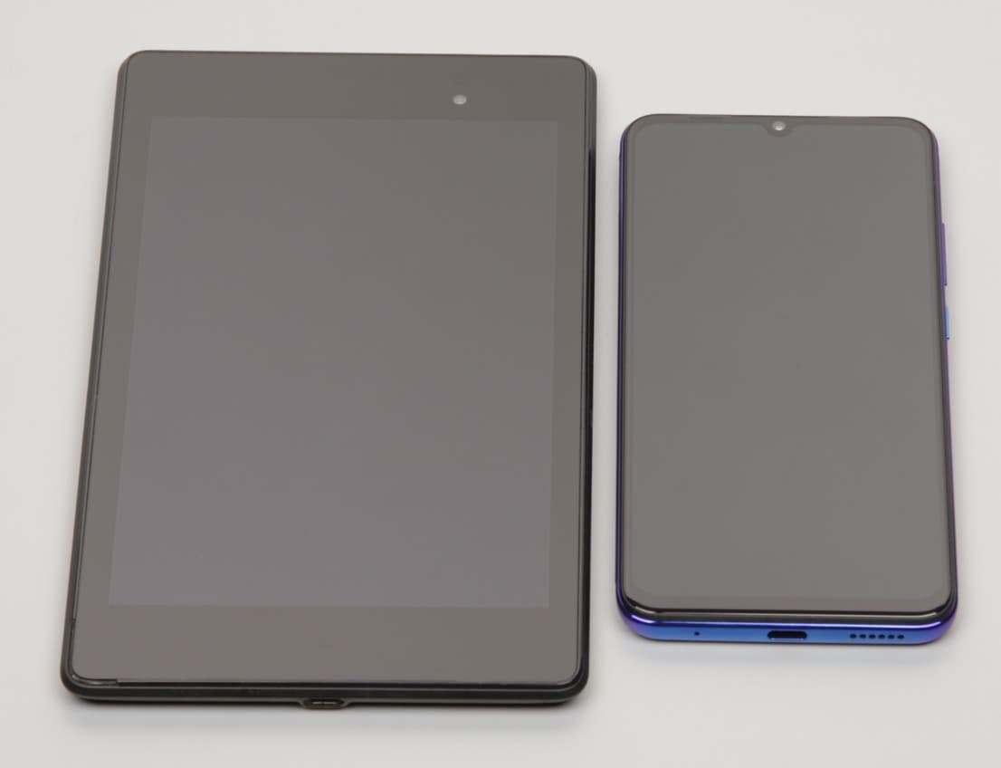 Лицевая поверхность экрана выполнена в виде стеклянной пластины с зеркально-гладкой поверхностью, устойчивой к появлению царапин. Судя по отражению объектов, антибликовые свойства экрана не хуже, чем у экрана Google Nexus 7 (2013) (ниже просто Nexus 7). Для наглядности приведем фотографию, на которой в выключенных экранах отражается белая поверхность (слева — Nexus 7, справа — Vivo V17, далее их можно различать по размеру):