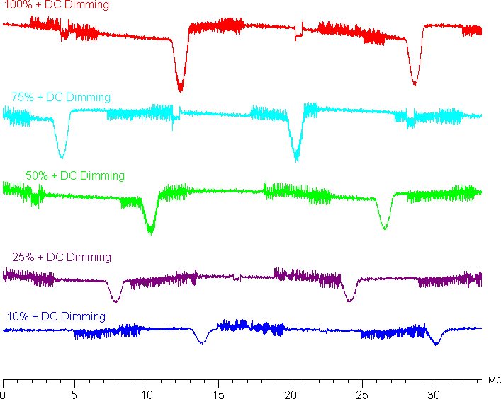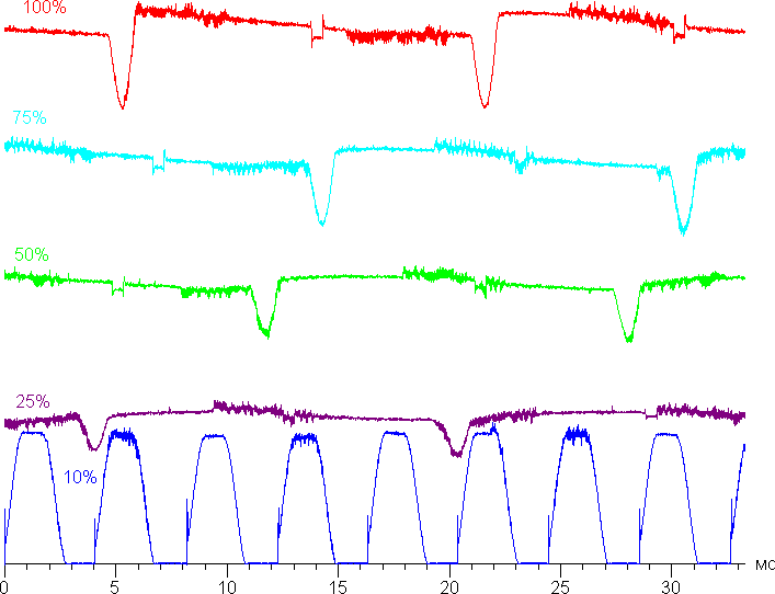 На любом уровне яркости присутствует значимая модуляция с частотой 61 или 245 Гц. На рисунке ниже приведены зависимости яркости (вертикальная ось) от времени (горизонтальная ось) для нескольких значений яркости: