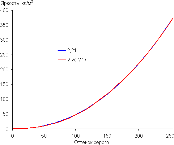 Построенная по 32 точкам с равным интервалом по численному значению оттенка серого гамма-кривая не выявила завала ни в тенях, ни в светах. Показатель аппроксимирующей степенной функции равен 2,21, что очень близко к стандартному значению 2,2, при этом реальная гамма-кривая практически совпадает со степенной зависимостью: