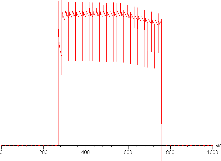 Переключение состояния элементов матрицы выполняется практически мгновенно, но на фронте включения (и реже — выключения) может присутствовать ступенька шириной примерно 17 мс (что соответствует частоте обновления экрана). Например, так выглядит зависимость яркости от времени при переходе от черного к белому и обратно: