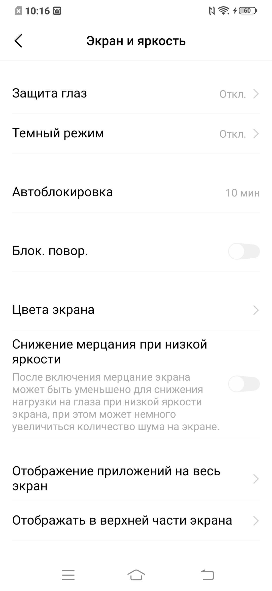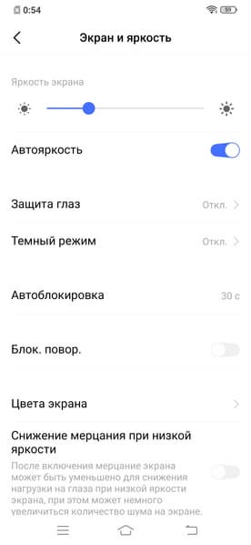 При ручном управлении яркостью и при выводе белого поля во весь экран максимальное значение яркости составило примерно 380 кд/м² в обычных условиях, на очень ярком свету оно повышается до 425 кд/м². В данном случае чем меньше площадь белого на экране, тем он светлее, то есть фактическая максимальная яркость белых участков будет почти всегда выше указанных значений. В итоге читаемость экрана днем на солнце должна быть на приемлемом уровне. Минимальное значение яркости — 2,3 кд/м², то есть пониженный уровень яркости без проблем позволяет использовать устройство даже в полной темноте. Есть автоматическая регулировка яркости по датчику освещенности (он расположен под экраном близко к верхнему краю правее центра). В автоматическом режиме при изменении внешних условий освещенности яркость экрана как повышается, так и понижается. Работа этой функции зависит от положения ползунка регулировки яркости: им пользователь может попытаться выставить желаемый уровень яркости в текущих условиях. Если оставить все по умолчанию, то в полной темноте функция автояркости уменьшает яркость до 6 кд/м² (темновато), в условиях освещенного искусственным светом офиса (примерно 550 лк) устанавливает на 100 кд/м² (нормально), а условно под прямыми лучами солнца повышает до 425 кд/м² (отлично). Результат нас не совсем устроил, поэтому в полной темноте мы чуть увеличили яркость, получив в итоге для трех условий, указанных выше, следующие значения: 14, 100 и 425 кд/м² (идеальное сочетание). Получается, что функция автоподстройки яркости работает адекватно и позволяет пользователю настраивать свою работу под индивидуальные требования.