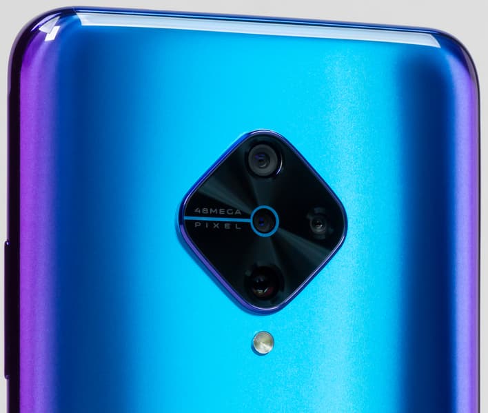 Тыльная камера у Vivo v17 формально четверная. На деле основной модуль с разрешением 48 Мп дополнен здесь широкоугольным (8 Мп) и двумя совсем простенькими (2 Мп) — для измерения глубины резкости сцены и макросъемки. Есть яркая вспышка, применяется фазовая (PDAF) автофокусировка. Есть возможность задействовать искусственный интеллект, который будет заниматься установкой оптимальных, по мнению автоматики, параметров съемки. Штатной возможности сохранять снимки в RAW нет, но никто не запрещает использовать для этого сторонние приложения.