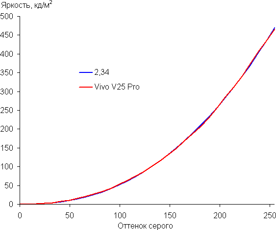 Напомним, что в случае OLED-экранов яркость фрагментов изображения динамично меняется в соответствии с характером выводимого изображения — слегка уменьшается для светлых в целом изображений. В итоге полученная зависимость яркости от оттенка (гамма-кривая), скорее всего, немного не соответствует гамма-кривой статичного изображения, так как измерения проводились при последовательном выводе оттенков серого почти на весь экран.