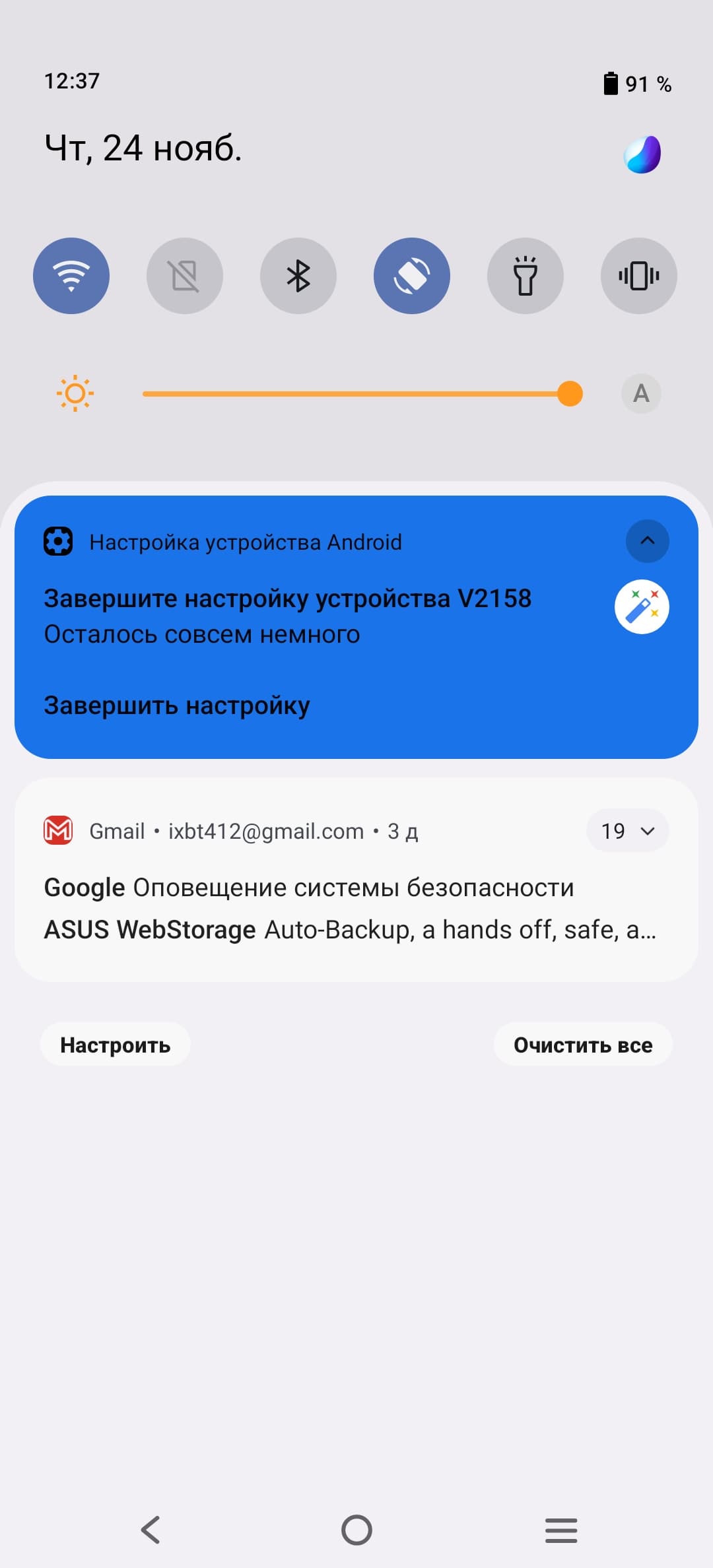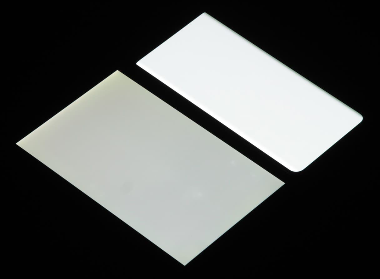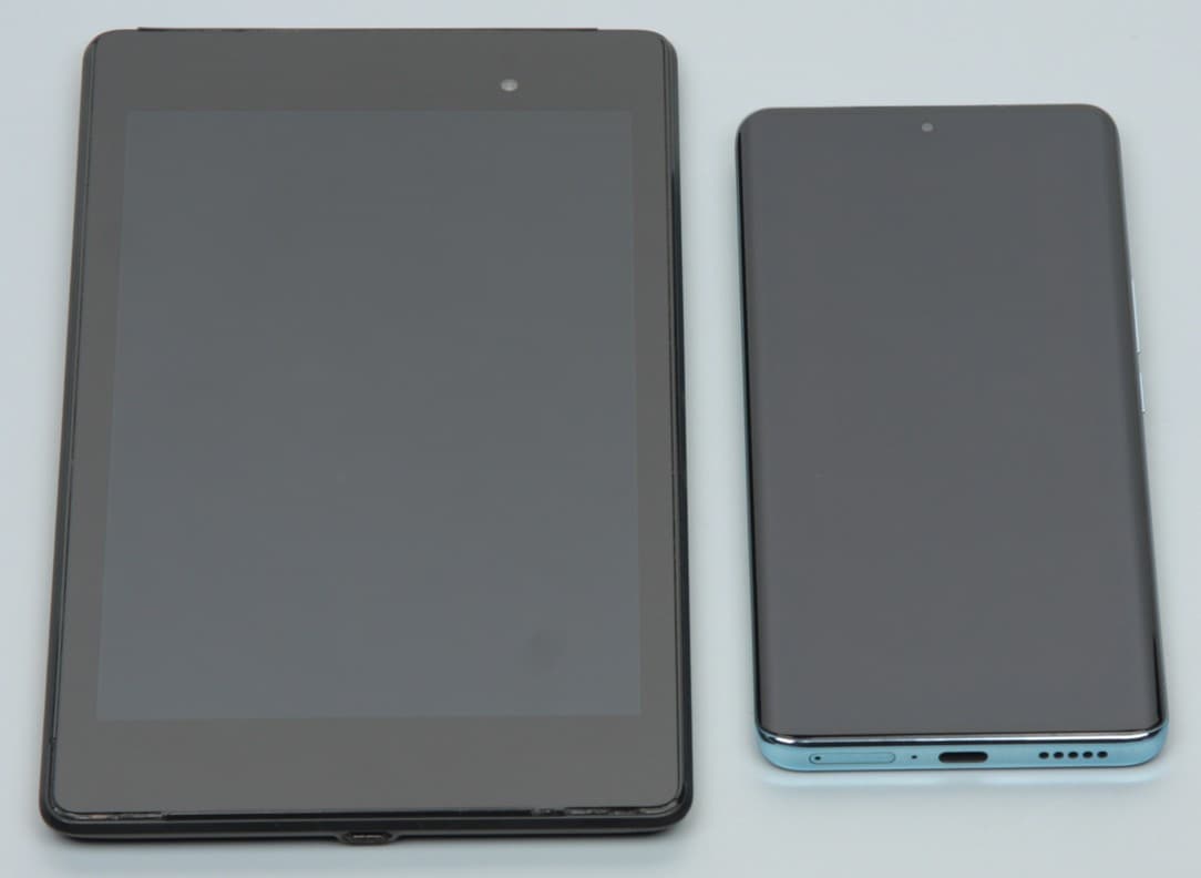 Лицевая поверхность экрана выполнена в виде стеклянной пластины с зеркально-гладкой поверхностью, устойчивой к появлению царапин. Судя по отражению объектов, антибликовые свойства экрана лучше, чем у экрана Google Nexus 7 (2013) (ниже просто Nexus 7). Для наглядности приведем фотографию, на которой в выключенных экранах отражается белая поверхность (слева — Nexus 7, справа — Vivo V25 Pro, далее их можно различать по размеру):
