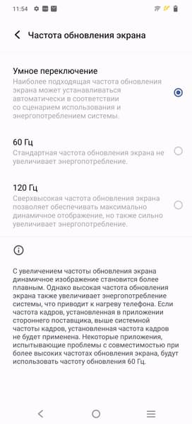 По критерию вывода кадров качество воспроизведения видеофайлов на экране самого смартфона хорошее, так как в большинстве случаев кадры или группы кадров могут (но не обязаны) выводиться с равномерным чередованием интервалов и без пропусков. В режиме с частотой обновления экрана 120 Гц воспроизведение видео все равно идет в режиме 60 кадр/с, поэтому в данном случае от этого режима пользы нет.