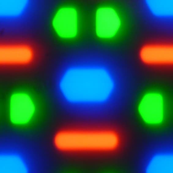 В этом экране используется матрица AMOLED — активная матрица на органических светодиодах. Полноцветное изображение создается с помощью субпикселей трех цветов — красного (R), зеленого (G) и синего (B), но красных и синих субпикселей в два раза меньше, что можно обозначить как RGBG. Это подтверждается фрагментом микрофотографии: