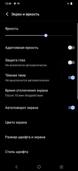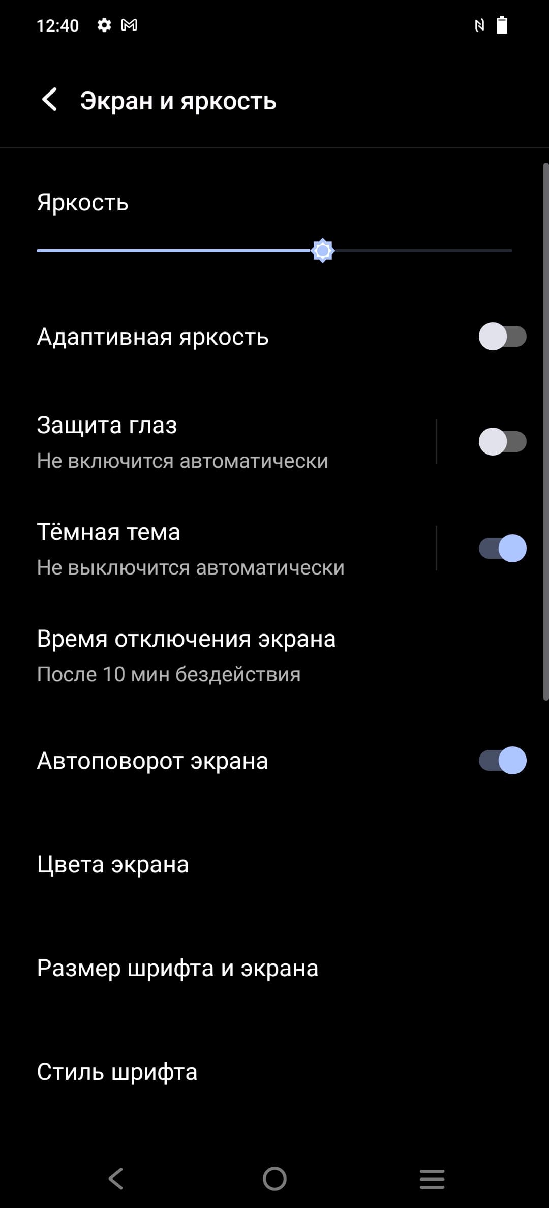 При ручном управлении яркостью и при выводе белого поля во весь экран максимальное значение яркости составило примерно 480 кд/м² в обычных условиях, на очень ярком свету оно повышается до 780 кд/м². Максимальная яркость очень высокая. В данном случае чем меньше площадь белого на экране, тем он светлее, то есть фактическая максимальная яркость белых участков будет почти всегда еще выше. В итоге, учитывая отличные антибликовые свойства, читаемость днем на солнце, должна быть на приемлемом уровне, а темная тема не только экономит заряд аккумулятора, но способствует лучшей разборчивости информации на экране в условиях высокой освещенности. Минимальное значение яркости — 1,7 кд/м², то есть пониженный уровень яркости без проблем позволяет использовать устройство даже в полной темноте. Есть автоматическая регулировка яркости по датчику освещенности (он расположен под экраном близко к верхнему краю правее центра). В автоматическом режиме при изменении внешних условий освещенности яркость экрана как повышается, так и понижается. Работа этой функции зависит от положения ползунка регулировки яркости: им пользователь может попытаться выставить желаемый уровень яркости в текущих условиях. Если оставить все по умолчанию, то в полной темноте функция автояркости уменьшает яркость до 4 кд/м² (темновато), в условиях освещенного искусственным светом офиса (примерно 550 лк) устанавливает на 100 кд/м² (нормально), а условно под прямыми лучами солнца повышает до 780 кд/м² (до максимума, так и нужно). Результат нас не совсем устроил, поэтому в полной темноте мы чуть увеличили яркость, получив в итоге для трех условий, указанных выше, следующие значения: 10, 100 и 780 кд/м² (идеальное сочетание). Получается, что функция автоподстройки яркости работает адекватно и позволяет пользователю настраивать свою работу под индивидуальные требования.
