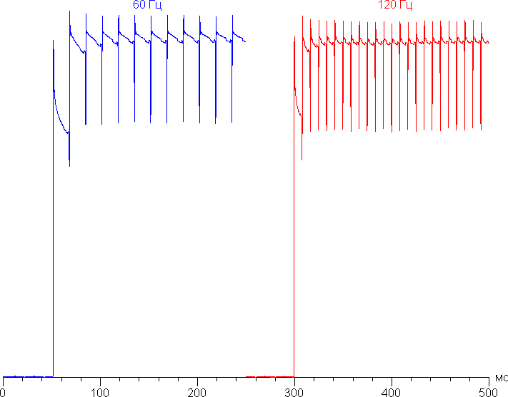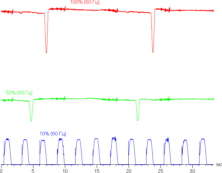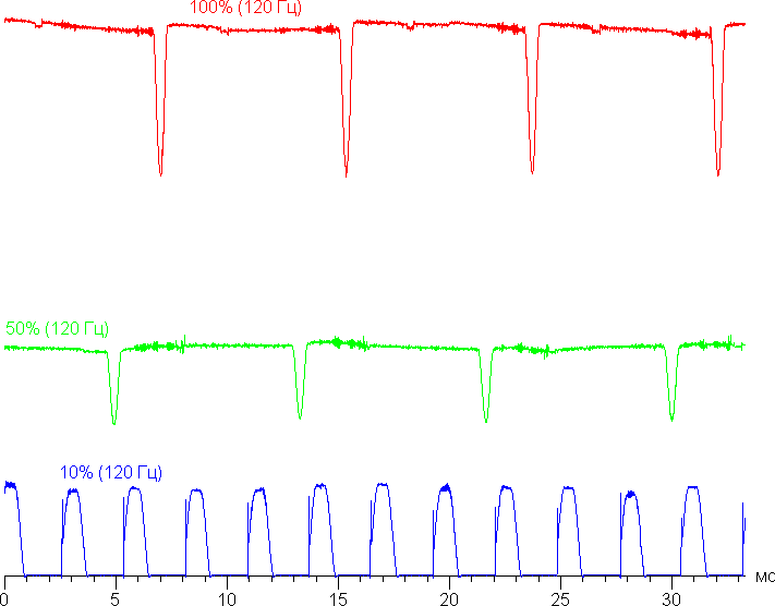 Частота модуляции на высокой яркости увеличилась до 120 Гц, а на низкой характер модуляции такой же, что и в случае частоты обновления 60 Гц. Отметим, что частота повышается до 120 Гц только в случае динамичного изображения, на статичном всегда 60 Гц.