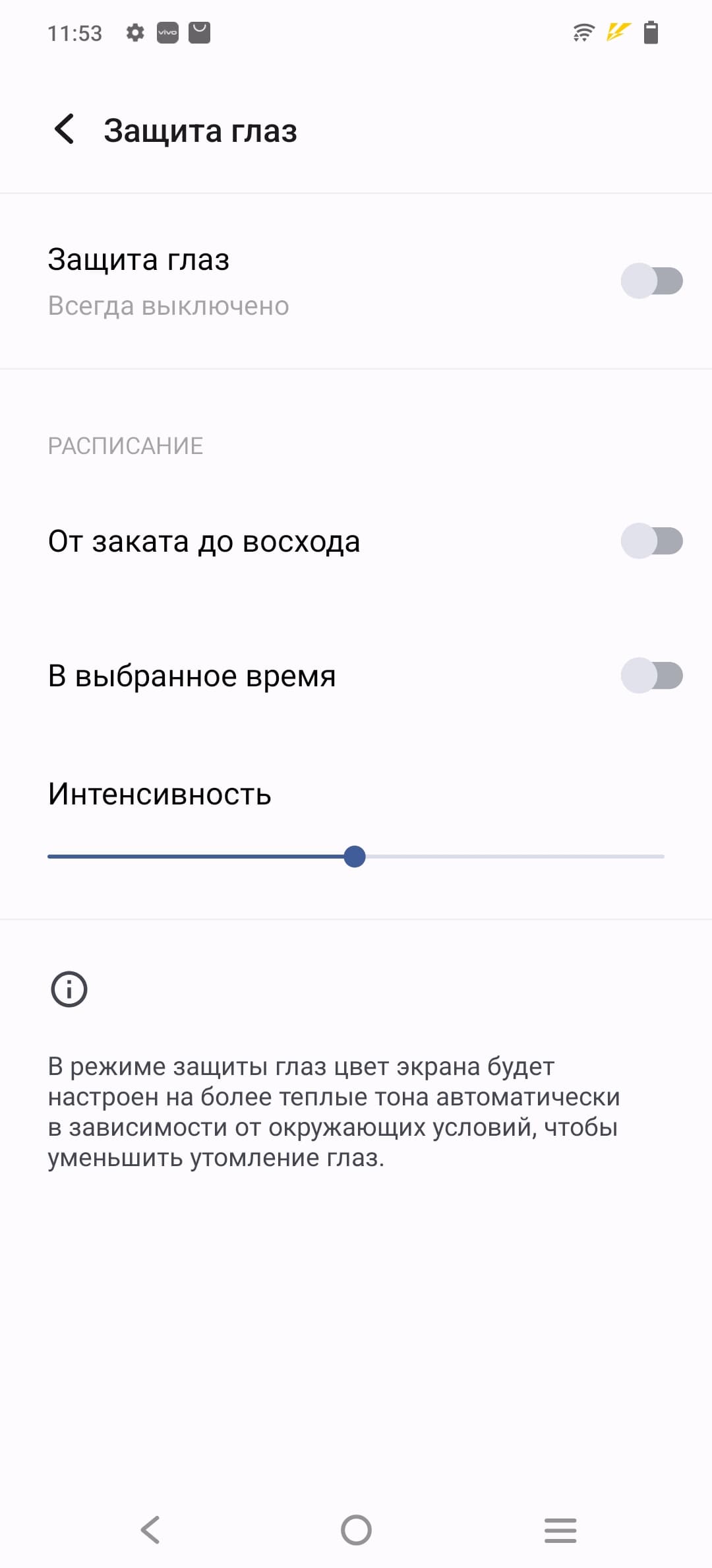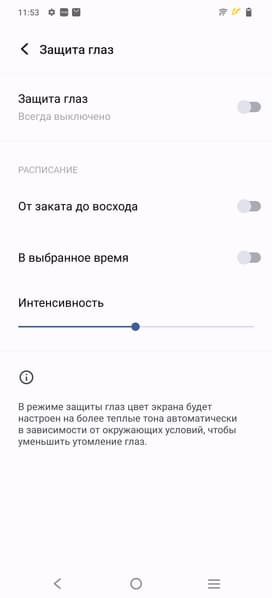 Разумеется, присутствует настройка (Защита глаз), позволяющая снизить интенсивность синей компоненты: