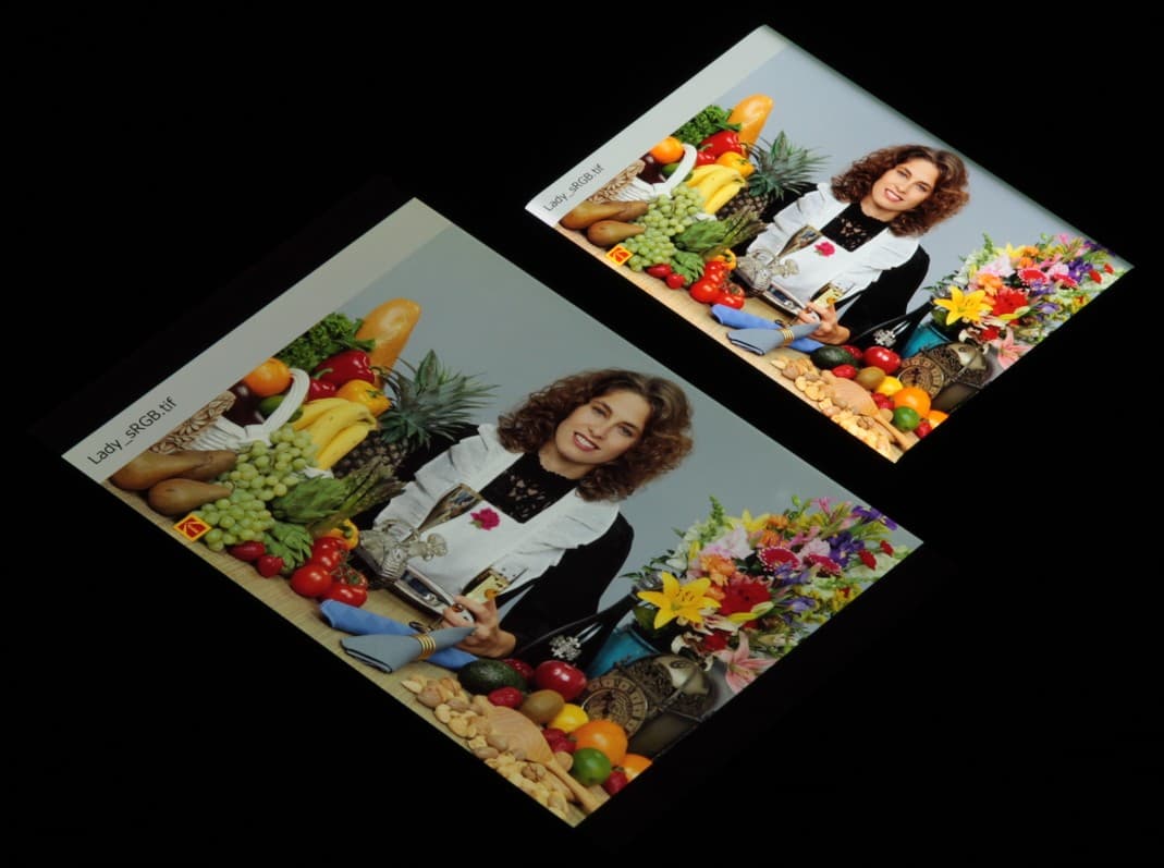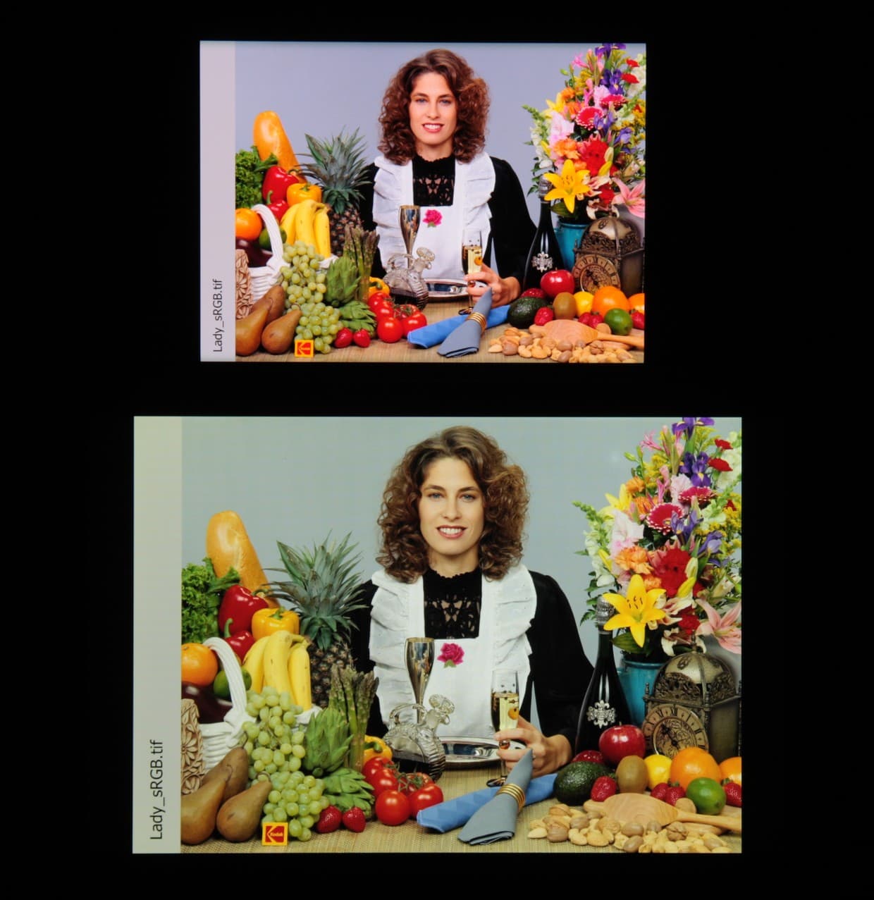 Согласно визуальной оценке, цвета у тестируемого экрана более-менее естественные, а цветовой баланс экранов немного различается. Напомним, что фотография не может служить надежным источником сведений о качестве цветопередачи и приводится только для условной наглядной иллюстрации. В частности, выраженный красноватый оттенок белого и серого полей, присутствующий на фотографиях тестируемого экрана, при перпендикулярном взгляде визуально отсутствует, что подтверждается аппаратными тестами с помощью спектрофотометра. Причина в том, что спектральная чувствительность матрицы фотоаппарата неточно совпадает с этой характеристикой человеческого зрения. Заметим, что в данном случае картинка занимает в высоту (при ландшафтной ориентации экрана) всю доступную для вывода изображения область и заходит на загнутые края экрана, что приводит к легкому затемнению и искажению цвета. Также на свету эти области почти всегда бликуют, что еще больше мешает при просмотре изображений, выведенных на весь экран. И даже картинка фильмов с соотношением сторон 16:9 заходит на загибы, что мешает при просмотре кино.