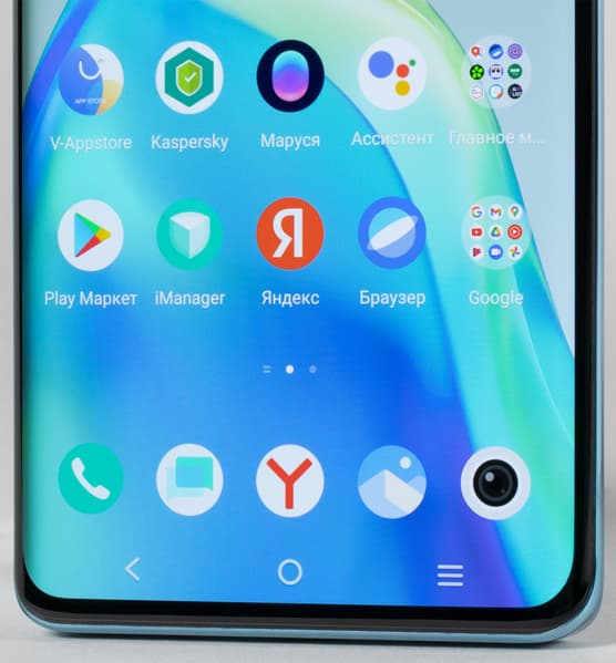 Фронтальная камера установлена за круглым вырезом в матрице экрана, но не сбоку, а прямо по центру, где она мешает сильнее. Светодиодного индикатора событий нет.